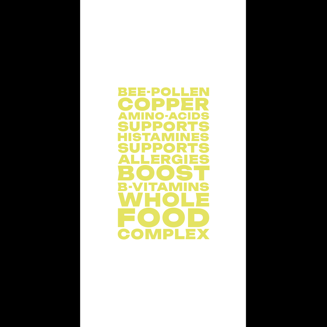 Bee Pollen is naturally rich in copper, amino acids, fats, and B-vitamins. It is often used for energy, nutrient density, and general wellness support.